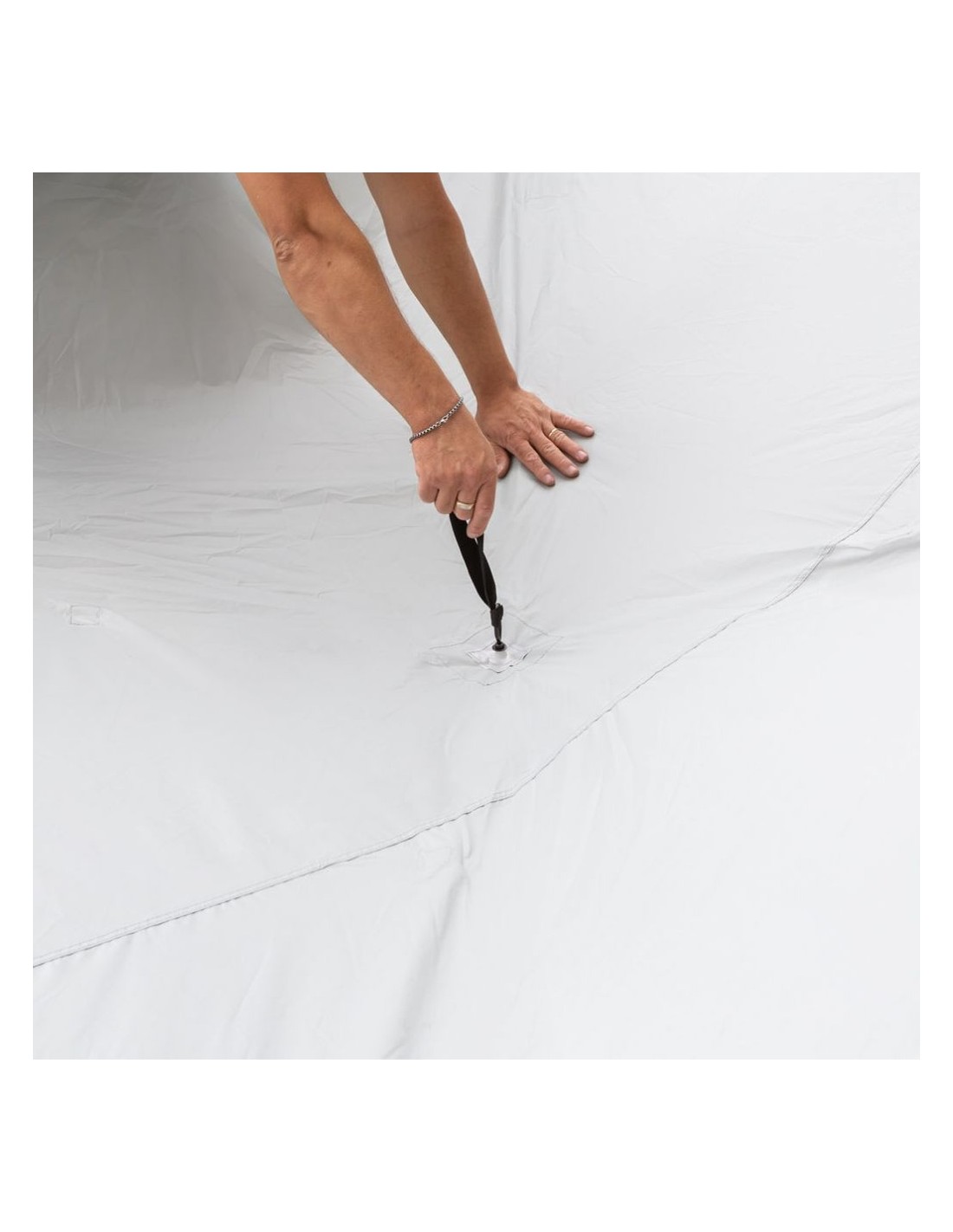 Markise für Kleinbusse und Transporter mit GFK-Gestell, mittiger Stabilisatorplatte und Öse zur Anbindung an das Fahrzeuglaufprofil.