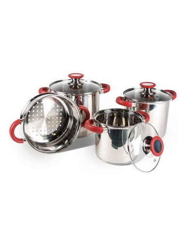 Packung mit 3-teiligen Töpfen mit den dazugehörigen Deckeln, die aus gehärtetem Glas bestehen, um hohen Temperaturen beim Kochen standzuhalten.