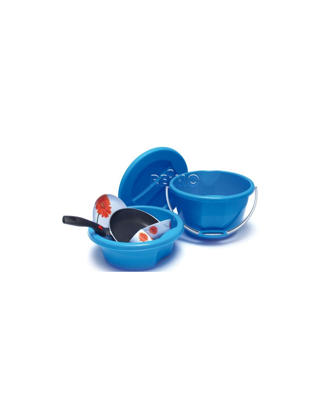 Die Mehrzweck-Eimer-Kombination besteht aus Eimer, Becken und Deckel.
