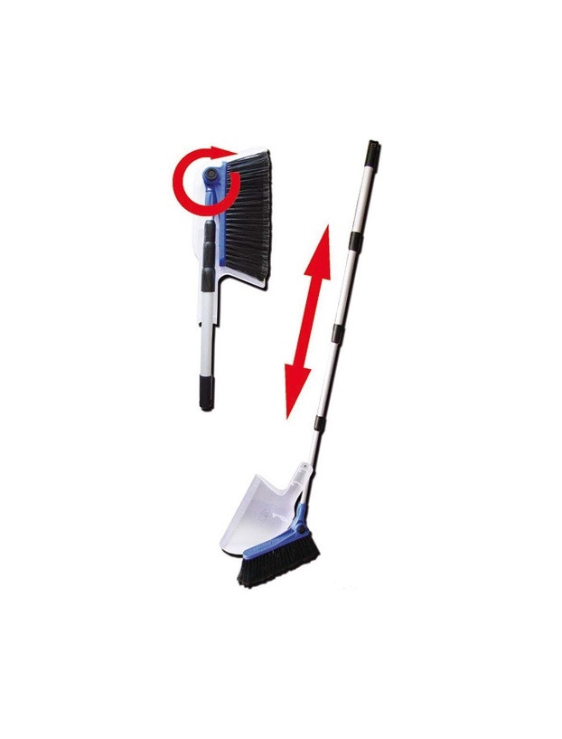 Besen und Kehrschaufel mit weichen Borsten, deren Kopf sich in verschiedenen Winkeln verstellen lässt, um Ihnen eine optimale Reinigungskontrolle zu ermöglichen.