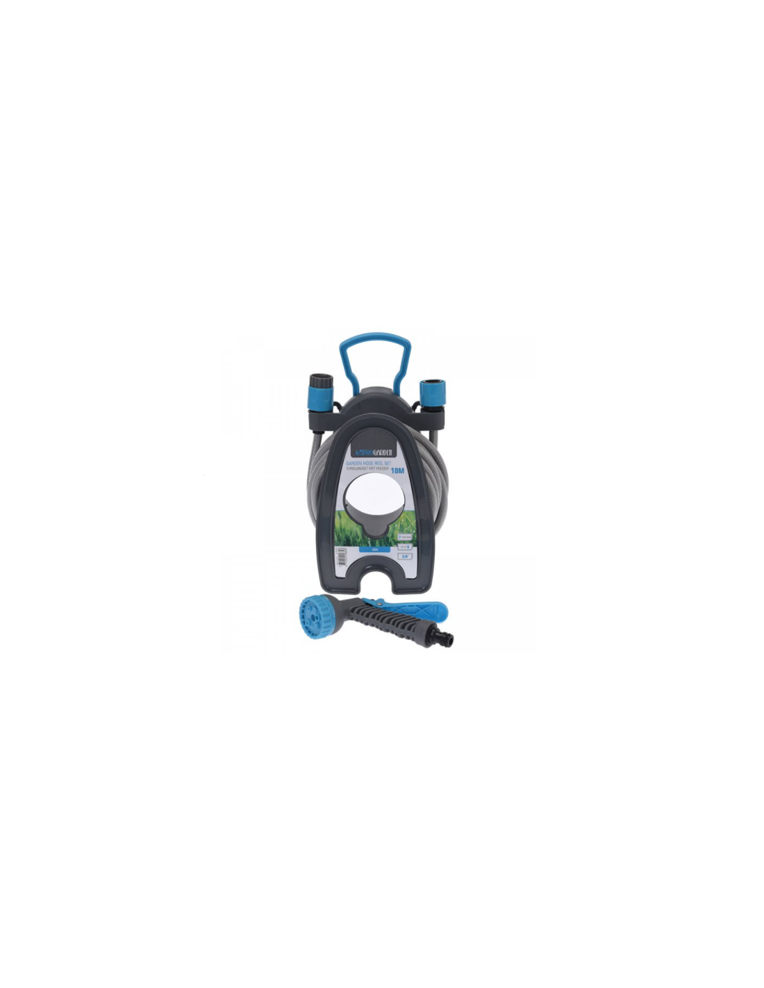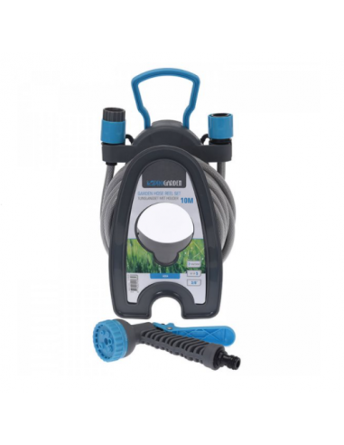 Tragbarer Schlauchaufroller mit 3/8" PVC-Schlauch und 2 Schnellkupplungen.
