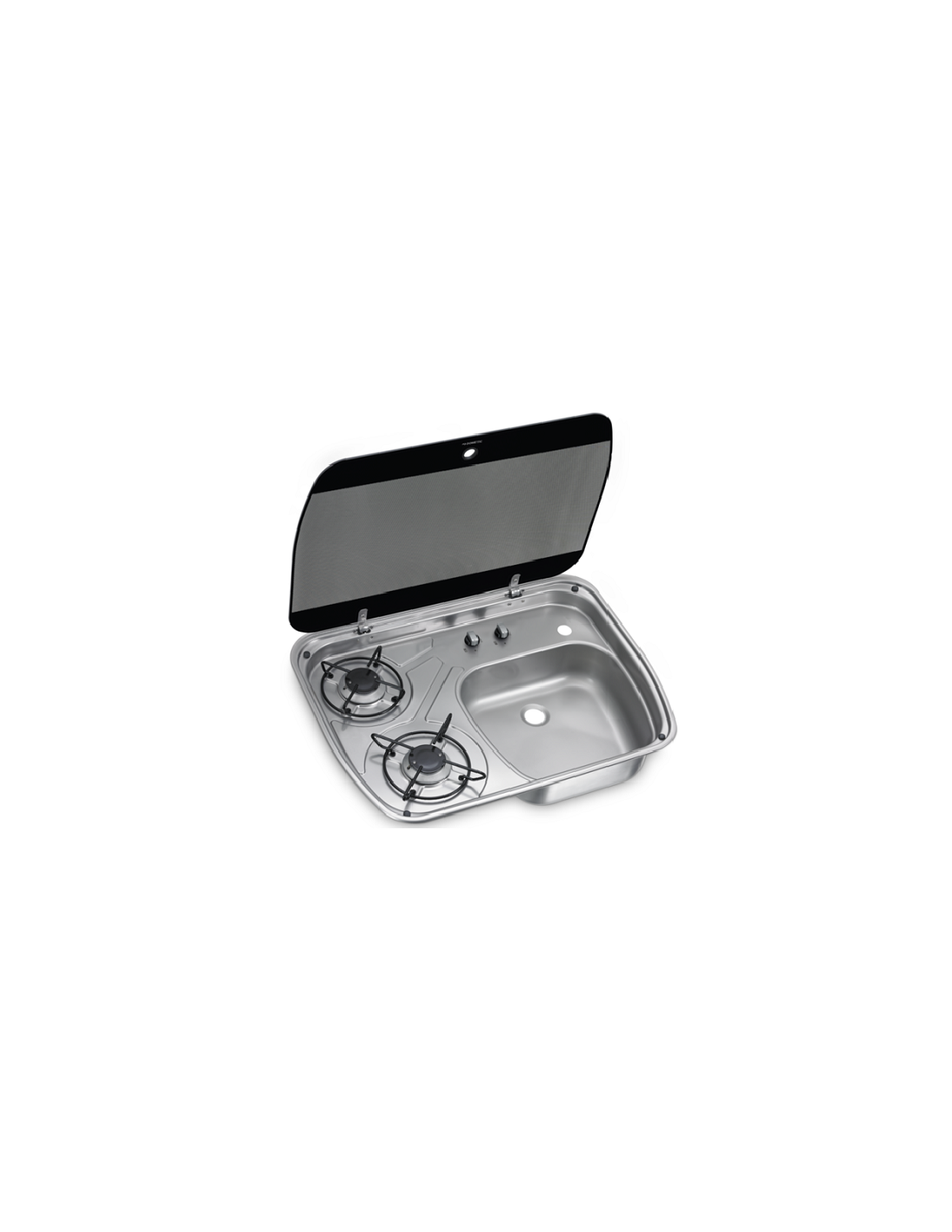Eine kompakte Kombination aus Kochfeld und Glasspüle mit zwei Brennern, mit der Sie die Vorteile des Kochens auch auf kleinstem Raum genießen können.