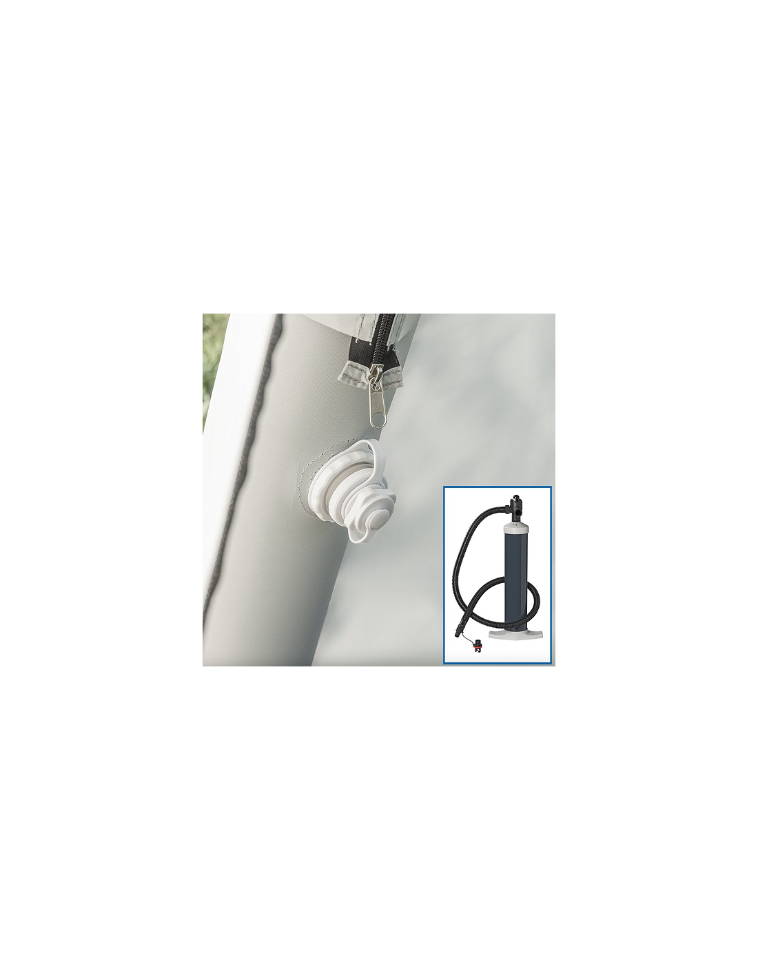 Lieferung mit Aufblaspumpe, Winddrähten, Heringen und Transporttasche.
