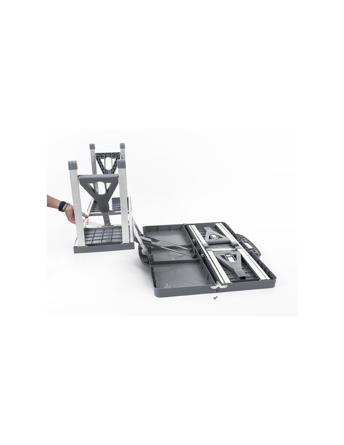 Der Tisch lässt sich in der Mitte zu einer Aktentasche zusammenklappen und verfügt über einen praktischen Tragegriff, der den Transport erleichtert.