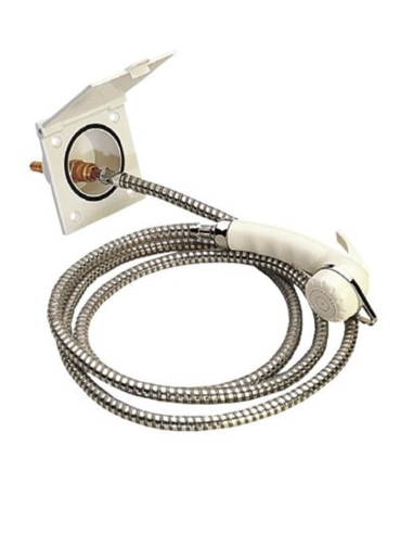 Fitted base with lid. 1.5 m hose. Hand shower with manual control. Copper springs with automatic opening of the water circuit when the hose is placed. Resist the pressure of automatic diaphragm pumps. Robust and functional system.