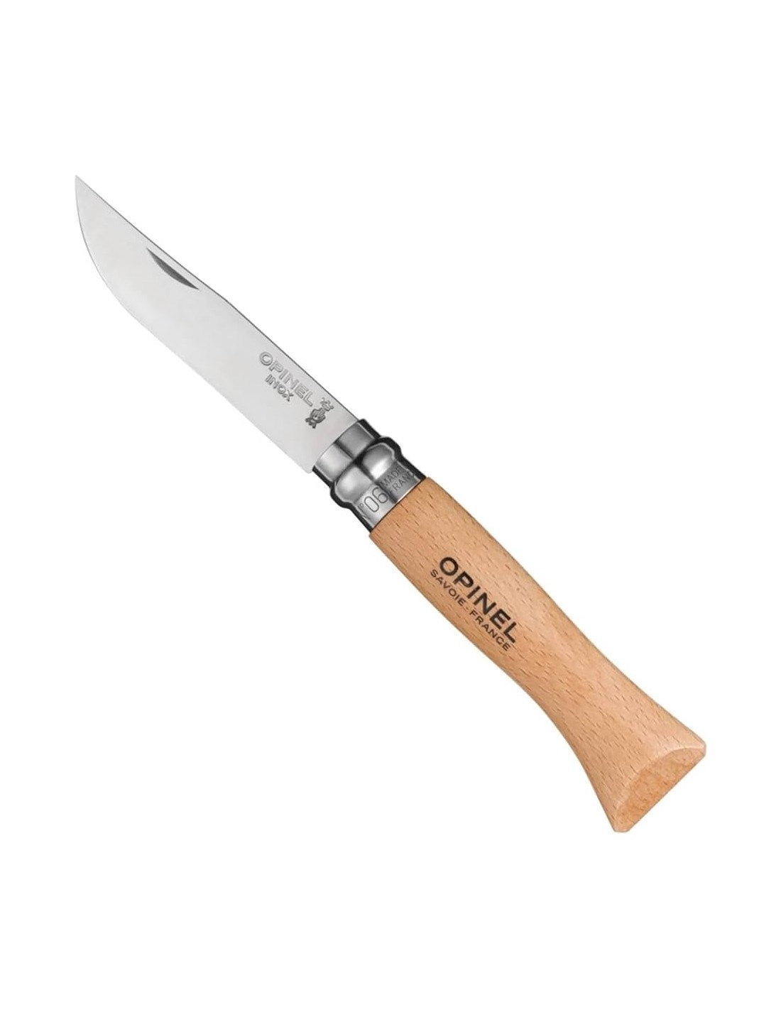 - The polished emerald blade measuring 8 cm and is made of carbon steel and the handle is made of beech, the most used wood Opinel .
