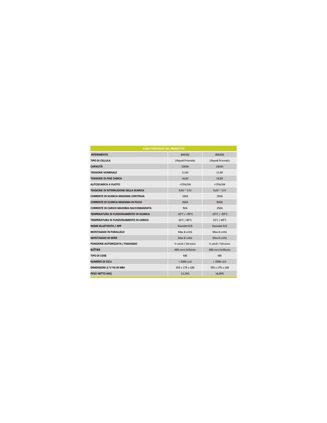 The Koonekt 100Ah lithium battery is a powerful and lightweight solution for powering outdoor activities, caravans, boats and emergency systems. Its LiFePo4 technology guarantees longer durability with over 2,000 charge cycles and lower self-discharge (<15% per year), ensuring reliable power even after long periods of inactivity.