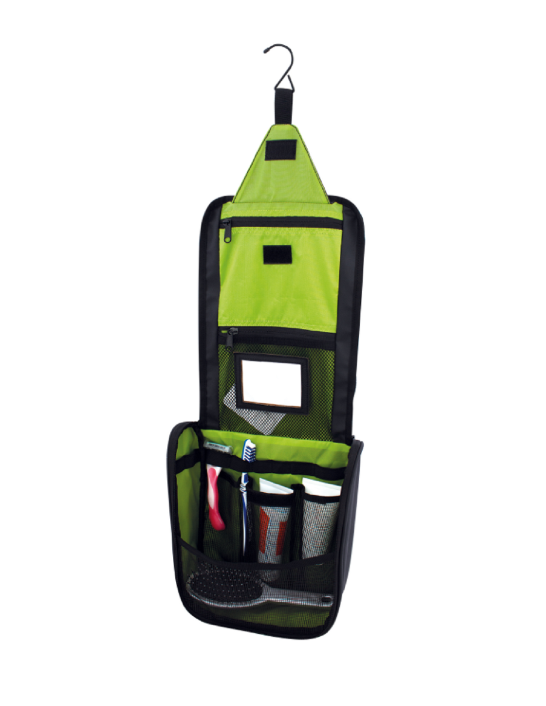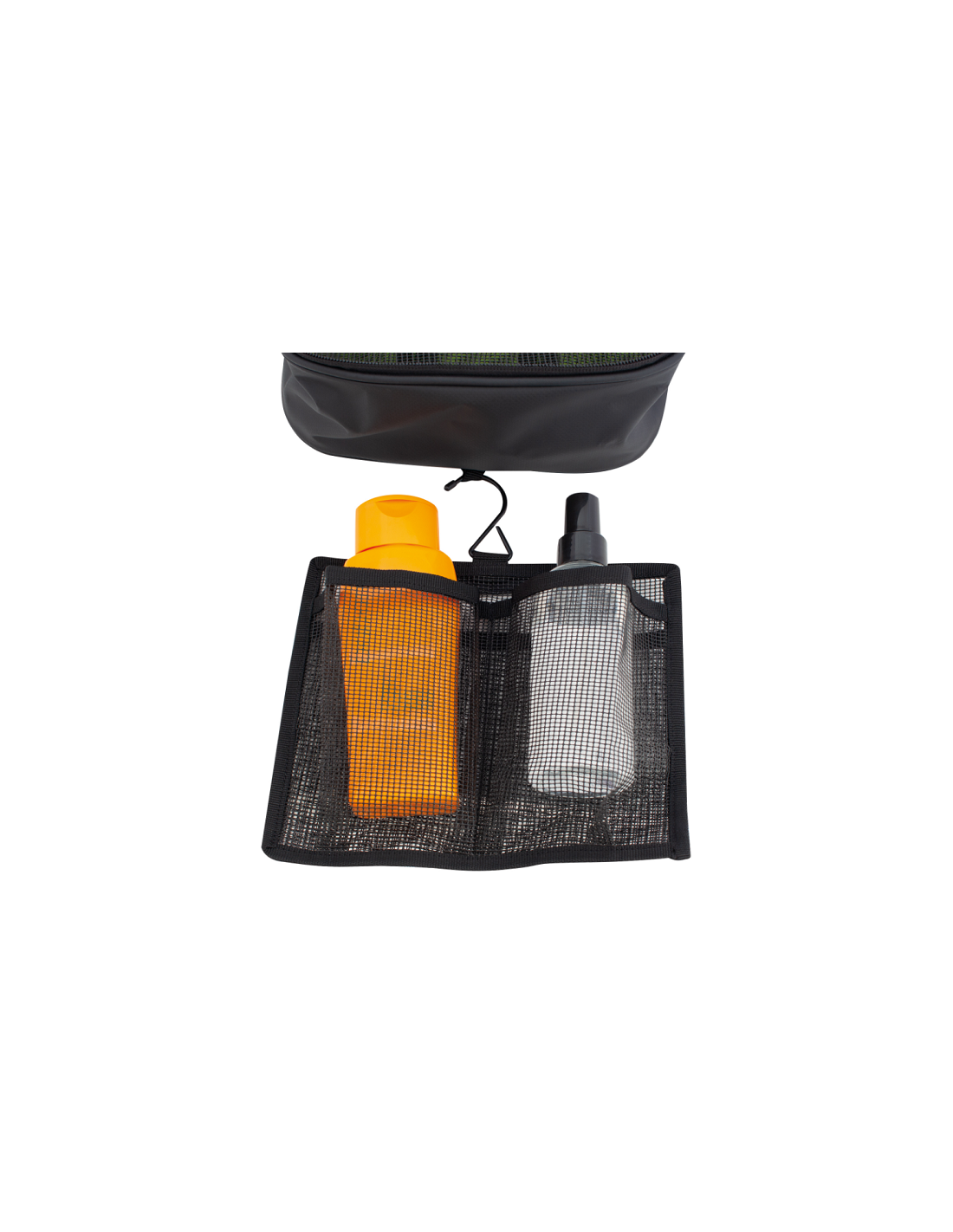Indoor toilet and shower bag This bag offers plenty of storage space and versatility. Special for all your toilet and shower items. The bag is made of water-repellent PVC fabric and comes with a storage bag. Removable inner mesh that you can use in the shower. With the hook you can hang the shower bag anywhere. Mesh pockets make it easy to store all your toiletries. Ideal for use while camping or on a weekend trip! Measurements: 24 x 25 x 10 cm. Fabric: 100% PVC polyester. Weight: 383 grams.