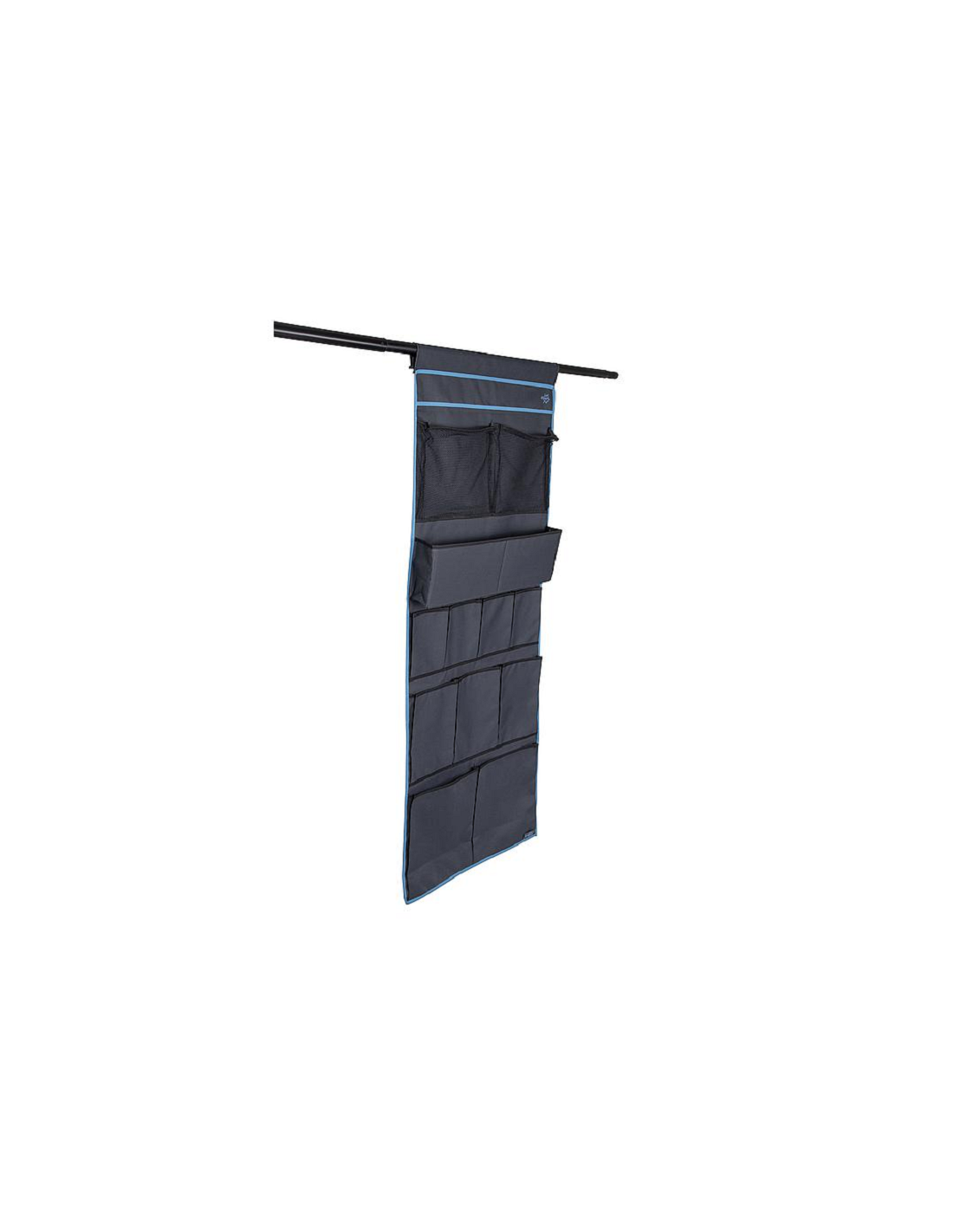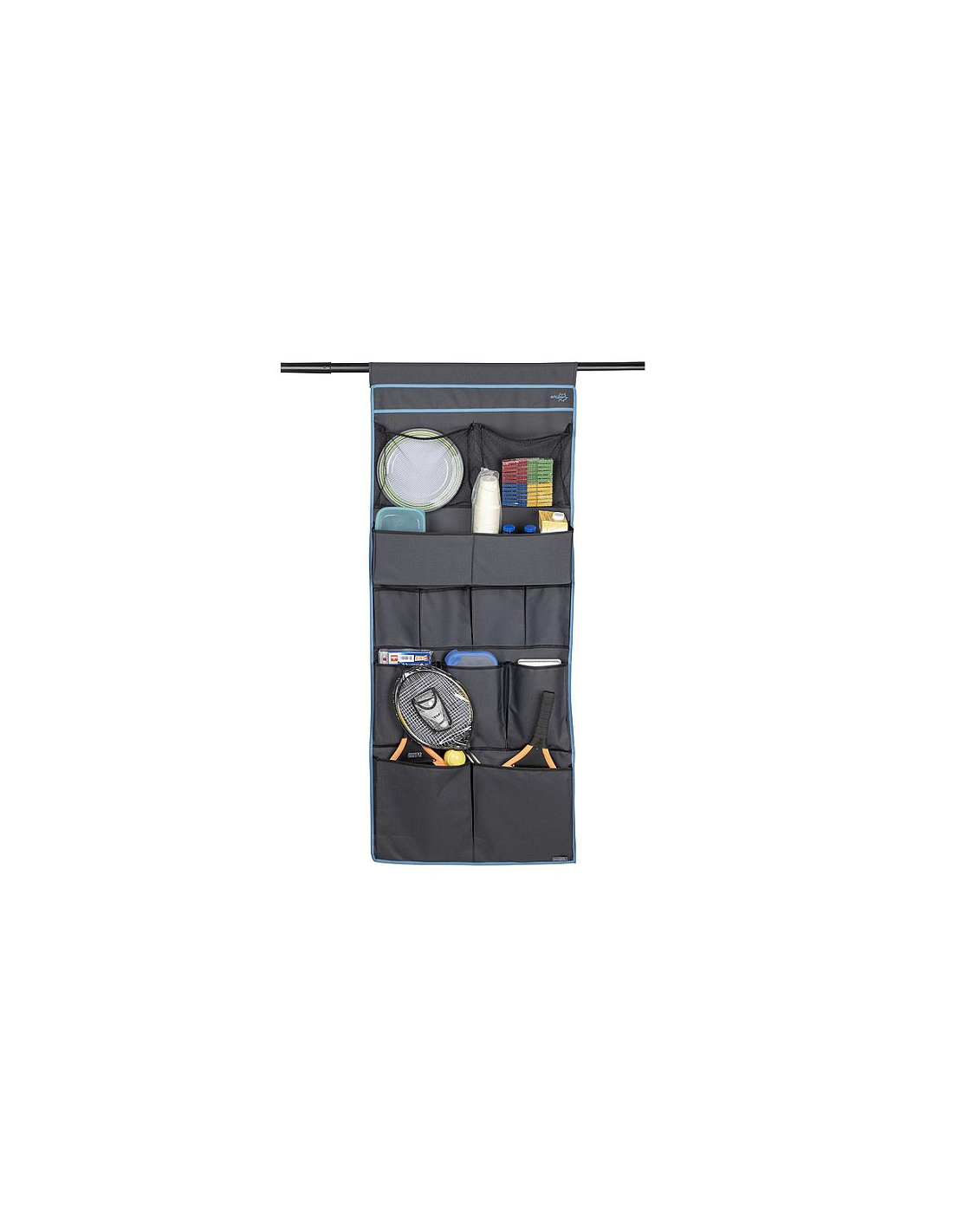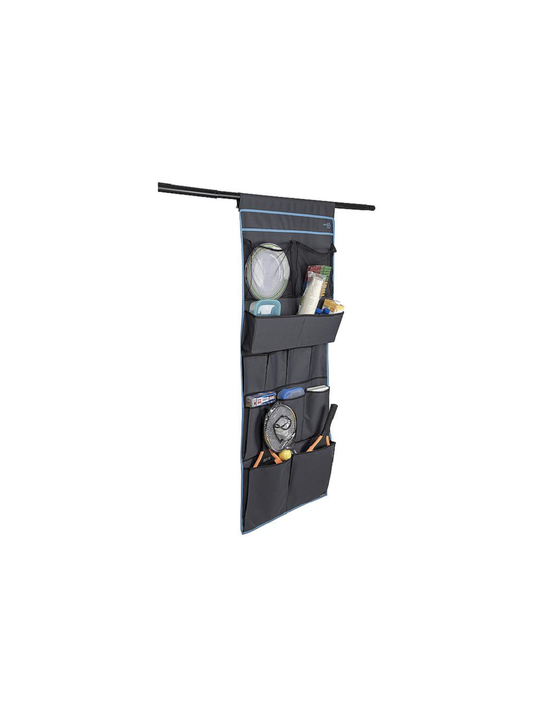 This tent organizer can be hung on a caravan rail using the cord or attached to a tent pole using velcro or on hooks using the grommets.