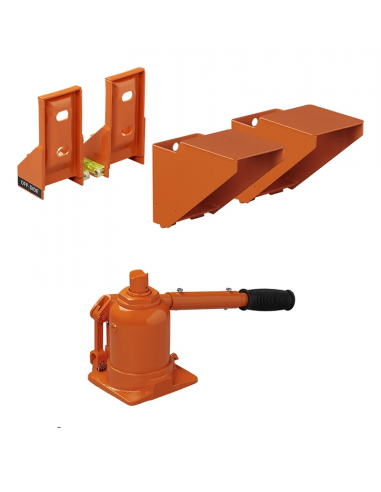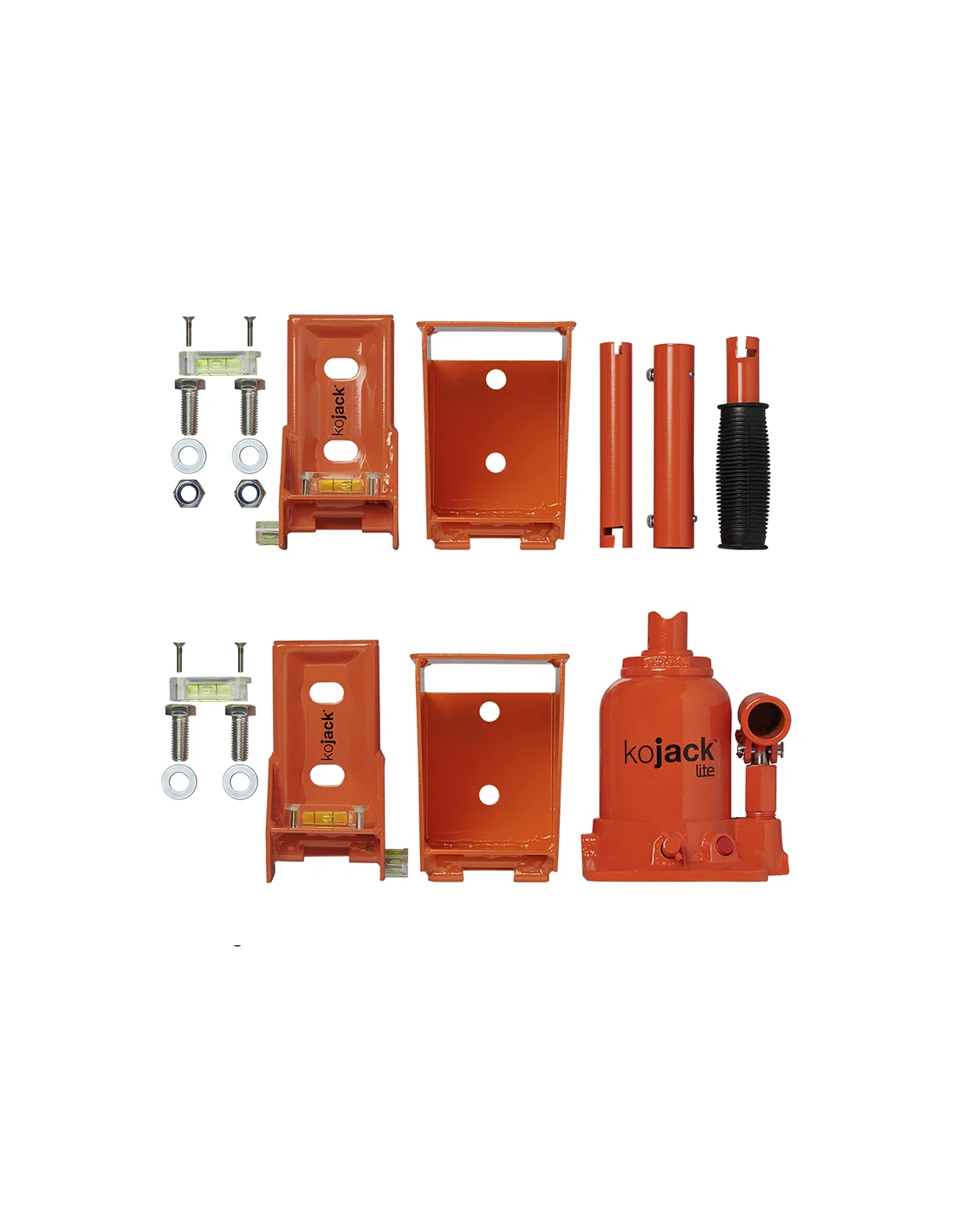 The KoJack set includes a 3-level hydraulic bottle jack, 2 chassis mounts with integrated spirit levels, 2 additional support mounts (double axle version) and all necessary accessories and fixings.