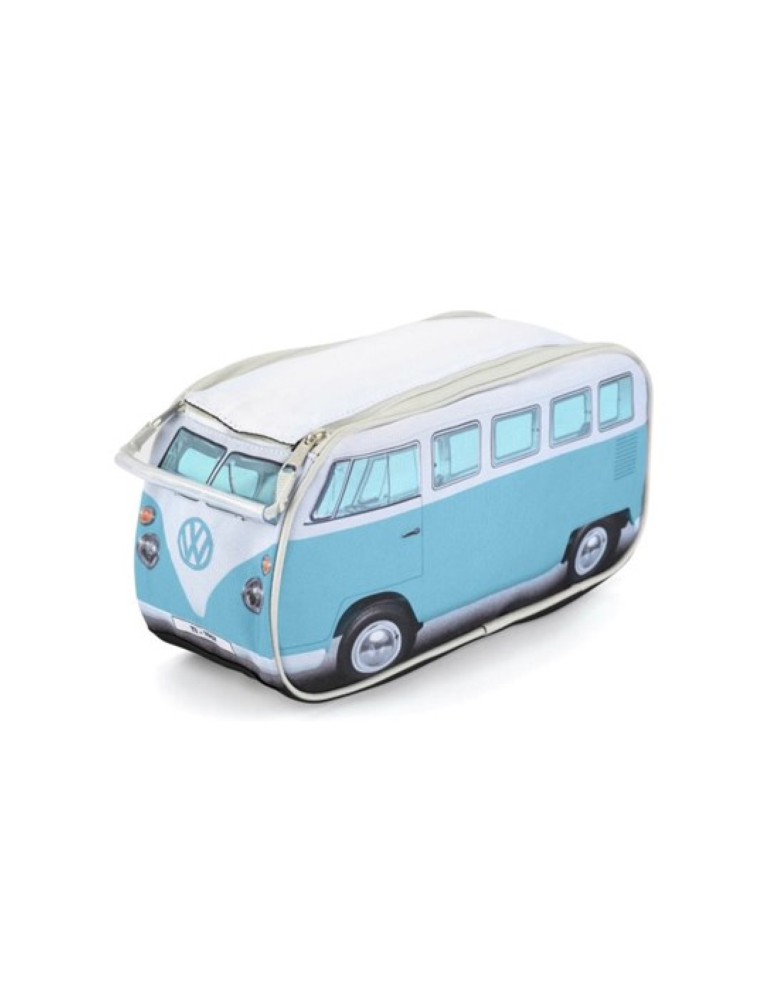 El neceser tiene un acabado que imita la forma de una furgoneta camper clásica, específicamente el modelo Volkswagen T1, famoso por su aspecto retro y nostálgico.