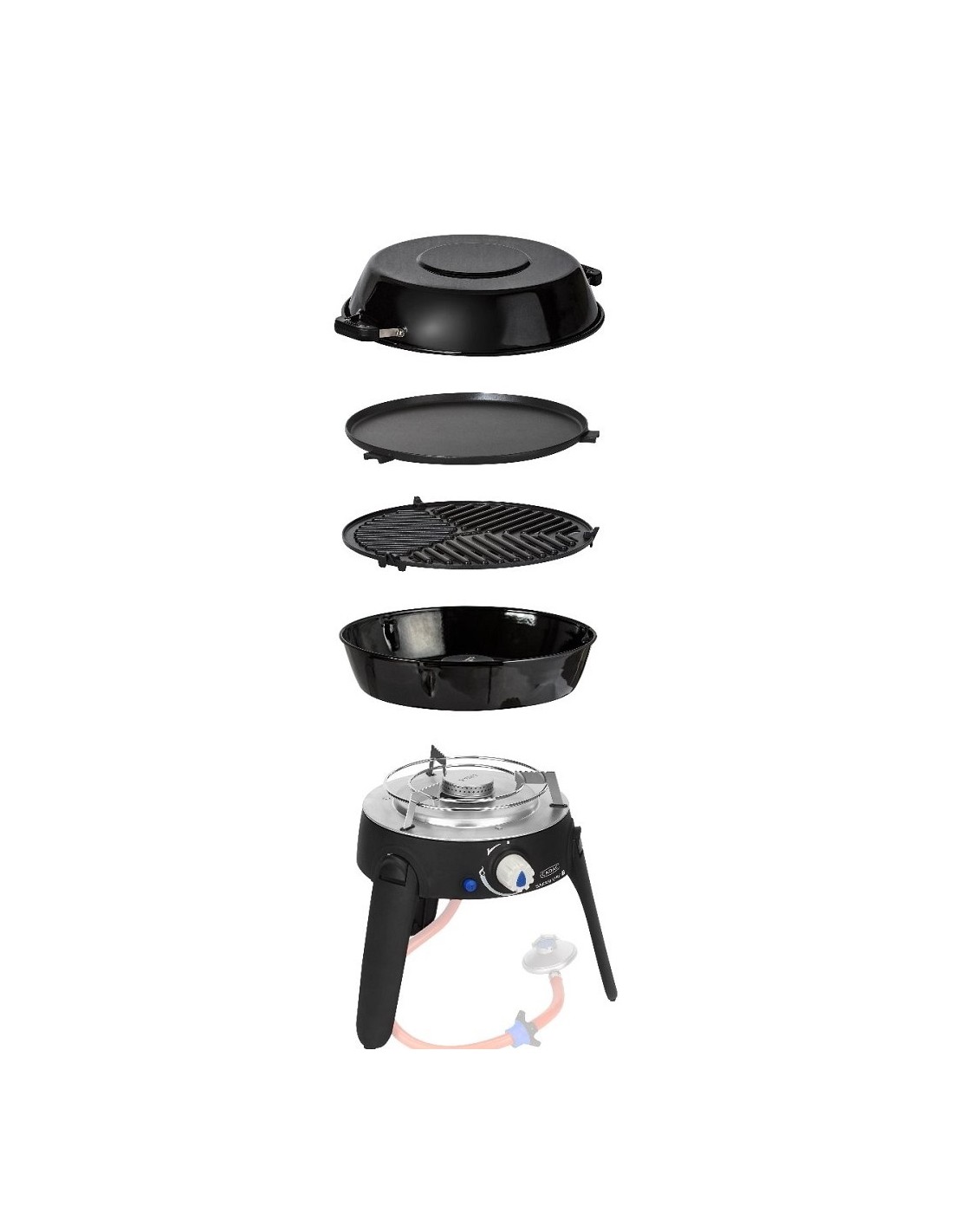 Presentada en esta versión LP, está alimentada únicamente por gas con un cartucho de gas tipo EN417. No se necesita una botella de gas butano o propano convencional con regulador y manguera. Es fácil de instalar. Aparte de esta diferencia, ofrece las mismas características que la versión HP compatible con las bombonas de gas convencionales. Es apreciado por su compacidad, con sus pies plegables, y su versatilidad, con sus 4 superficies de cocción.Transportable en cualquier lugar, es ligero (3,6 Kg).