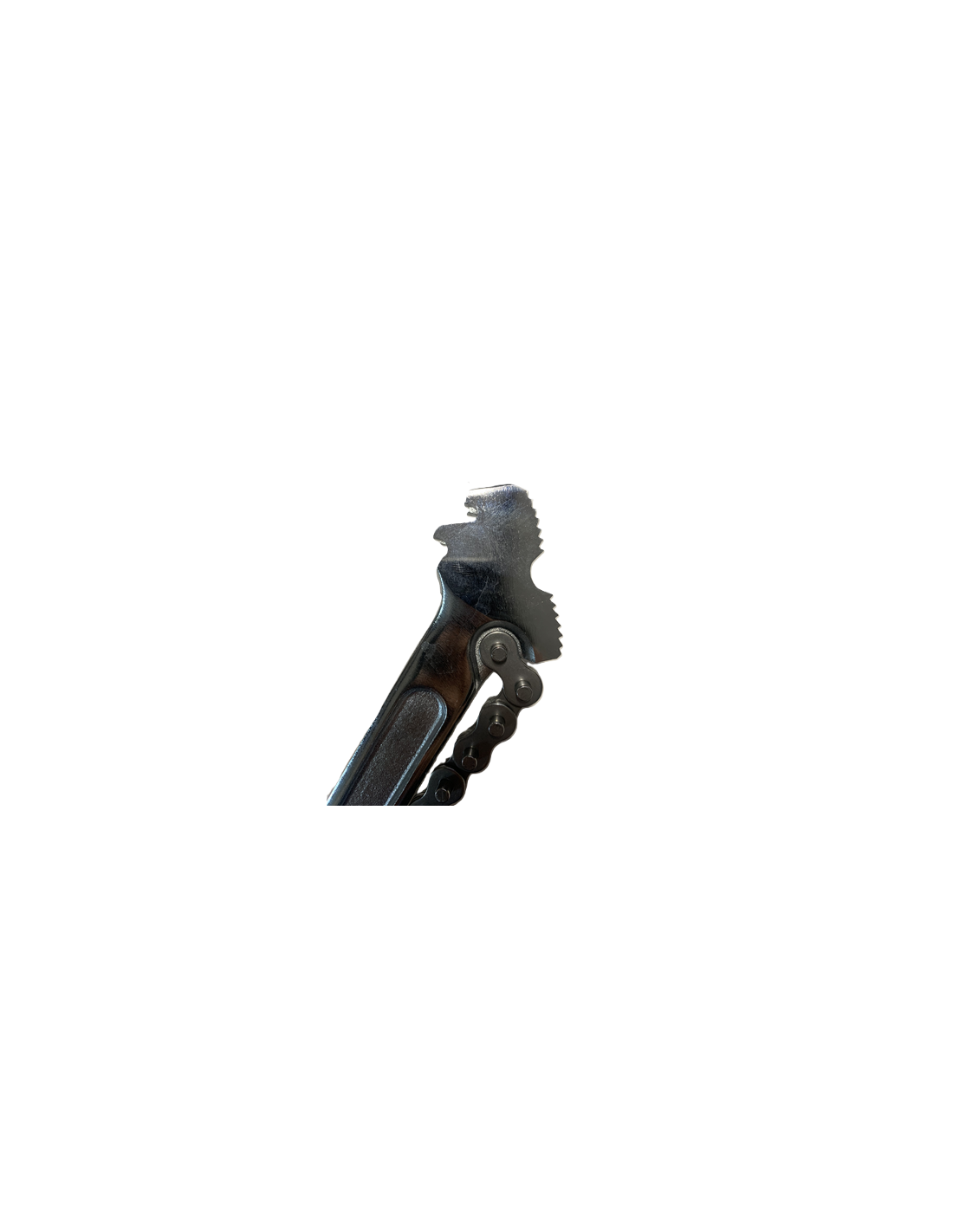 - La clé dispose de quatre onglets pour sécuriser la chaîne et a une longueur de 48 cm. La chaîne a une longueur de 50 cm et la clé 37,5 cm.