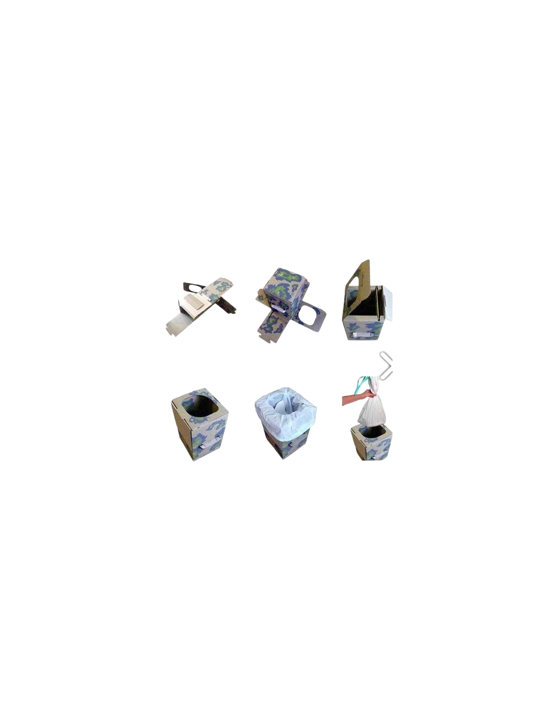 1- Ouvrir la boîte, retirer et assembler le siège en carton. 2- Ouvrir le sac de protection des toilettes. Placer le sac sur le siège des toilettes et le fixer. Le tampon absorbant doit être placé au fond du sac. 3- Utiliser les toilettes. 4- Après utilisation, le contenu se gélifie ; fermer le sac et le jeter dans un endroit approprié. Siège en carton réutilisable plusieurs fois ; sacs et tampons absorbants à usage unique.