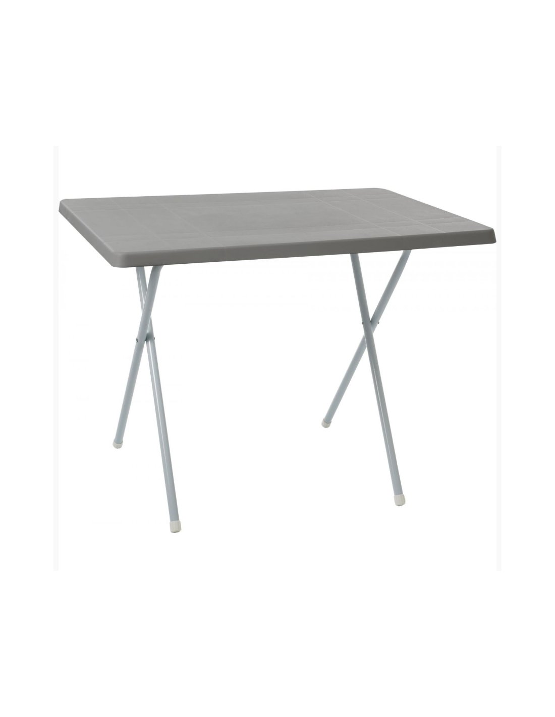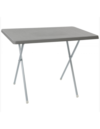 Table de loisirs avec structure en ciseaux en matériau thermolaqué et plateau en plastique résistant aux intempéries.