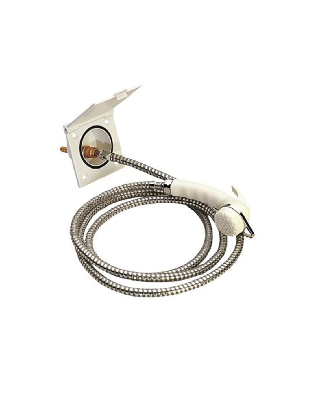 Base ajustée avec couvercle. tuyau de 1,5 m. Douche à main avec commande manuelle. Ressorts en cuivre avec ouverture automatique du circuit d'eau lorsque le tuyau est placé. Résiste la pression des pompes automatiques de diaphragme. Système robuste et fonctionnel.