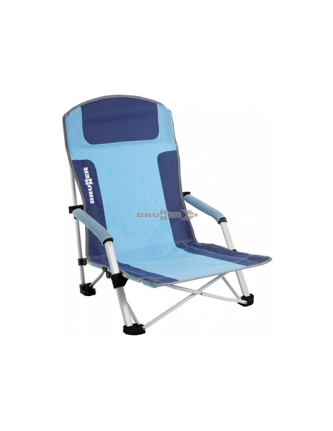 Chaise de plage pliante compacte avec de nouveaux accoudoirs et pieds larges.