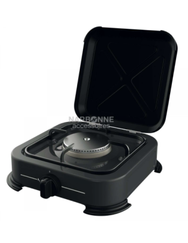 Réchaud en acier émaillé avec feu et couvercle basculant amovible.