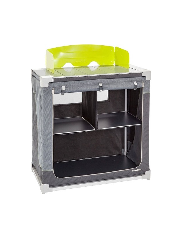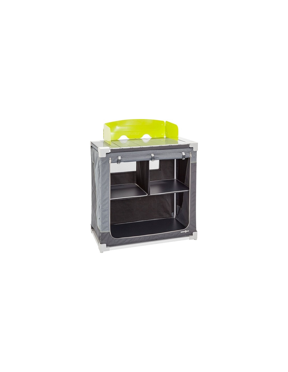 1) Armoire avec seau, avec espace intérieur divisible et ouverture pour placer une bouteille de gaz ou mettre une bassine. Plan de travail amovible et enroulable en aluminium thermolaqué avec plateau intégré.