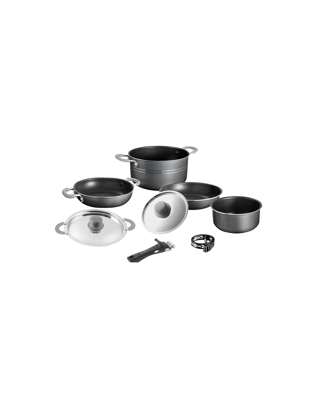Il set è composto da: 1 grande pentola (4L), 1 medio piattino (1,6L), 1 padella con maniglie (1,5L), 1 padella senza maniglie (1L), 1 coperchio medio, 1 filtro in plastica, 1 morsetti smontabili e 1 cintura.