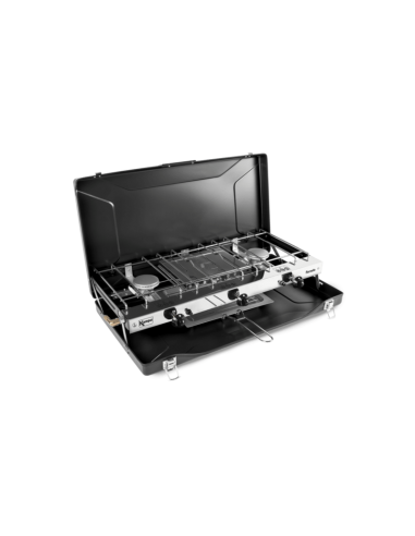 Questo barbecue a gas compatto permette di cucinare, arrostire e anche mettere una padella su di esso grazie alle sue diverse superfici di cottura.