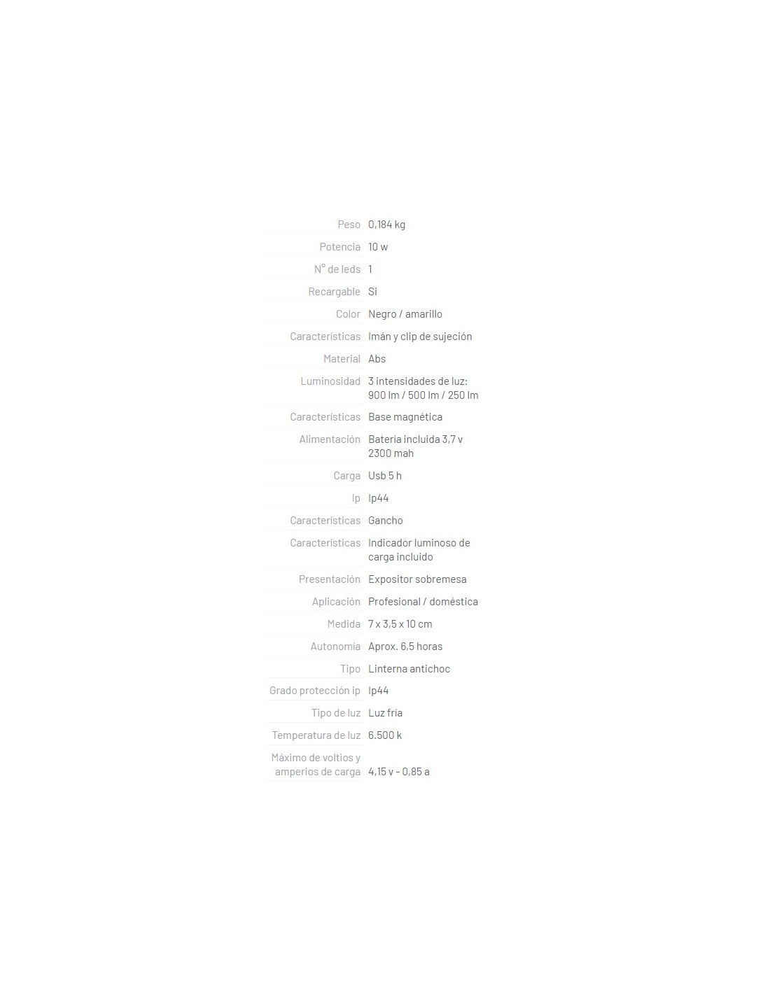 Torcia a led compatta ricaricabile 10w 900lm 7000k Carica per usb, fino a 6,5h autonomia, batteria ricaricabile 3,7v 2300mah. Include gancio clip, magnete, indicatore di carico. 3 modalità di illuminazione: 900lm, 500lm e 250lm. Resistenza allo spruzzo ip44. Luce: 7000k Misurato: 7x3,5x10cm (ancho/fondo/alto) Torcia antichoc. EDM