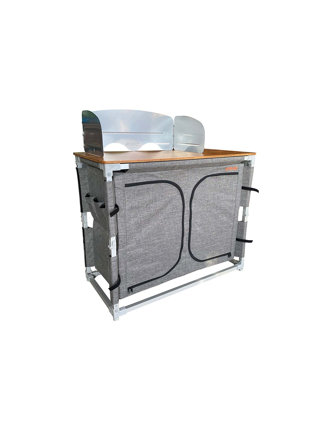 Mobili da cucina con piano in bambù perfetto per il campeggio.