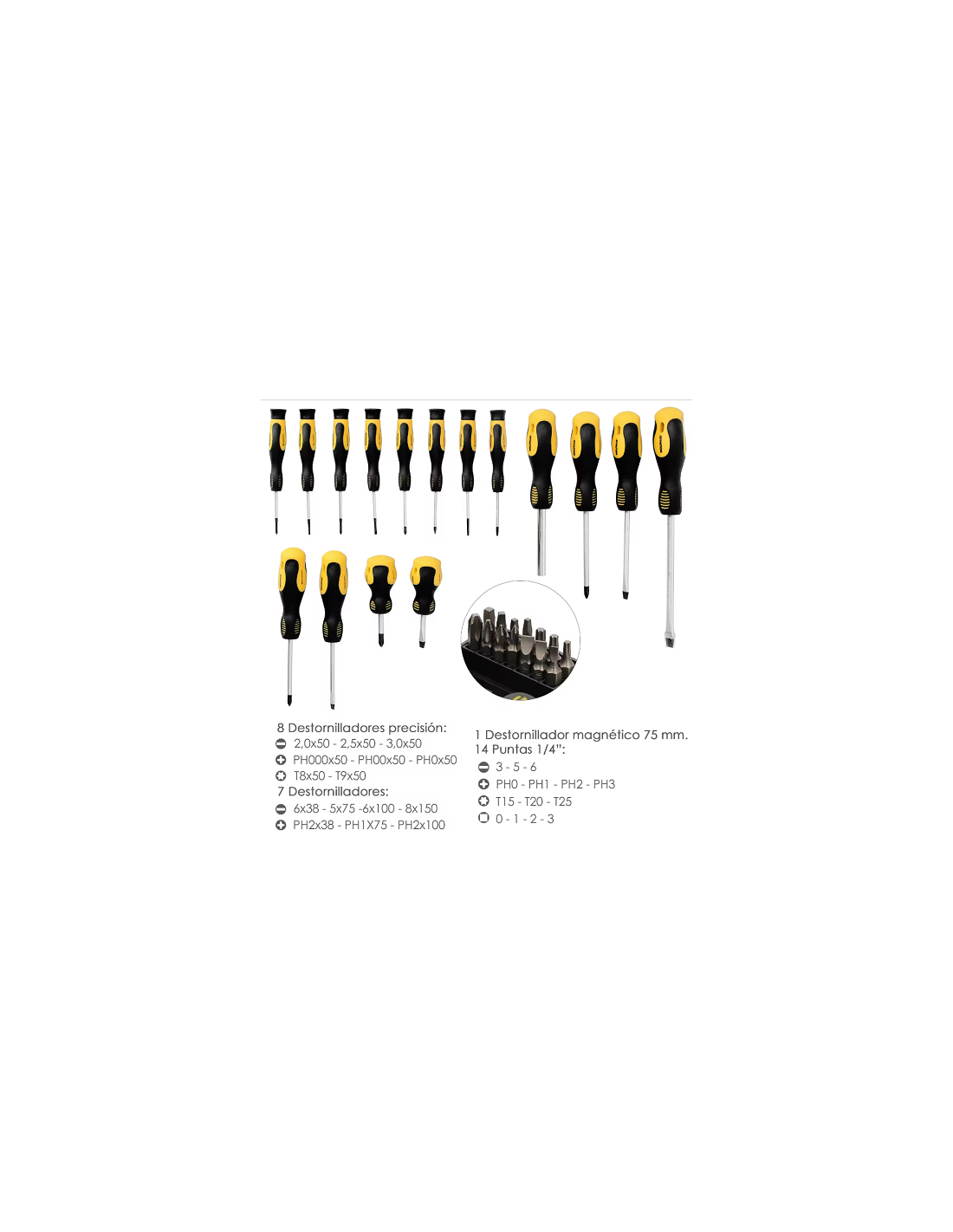 - 14 punte 25 mm: piatto (3 / 5 / 6), Phillips (PH0 / PH1 / PH2 / PH3), Torx (T15 / T20 / T25) e Robertson (0 / 1 / 2 / 3).