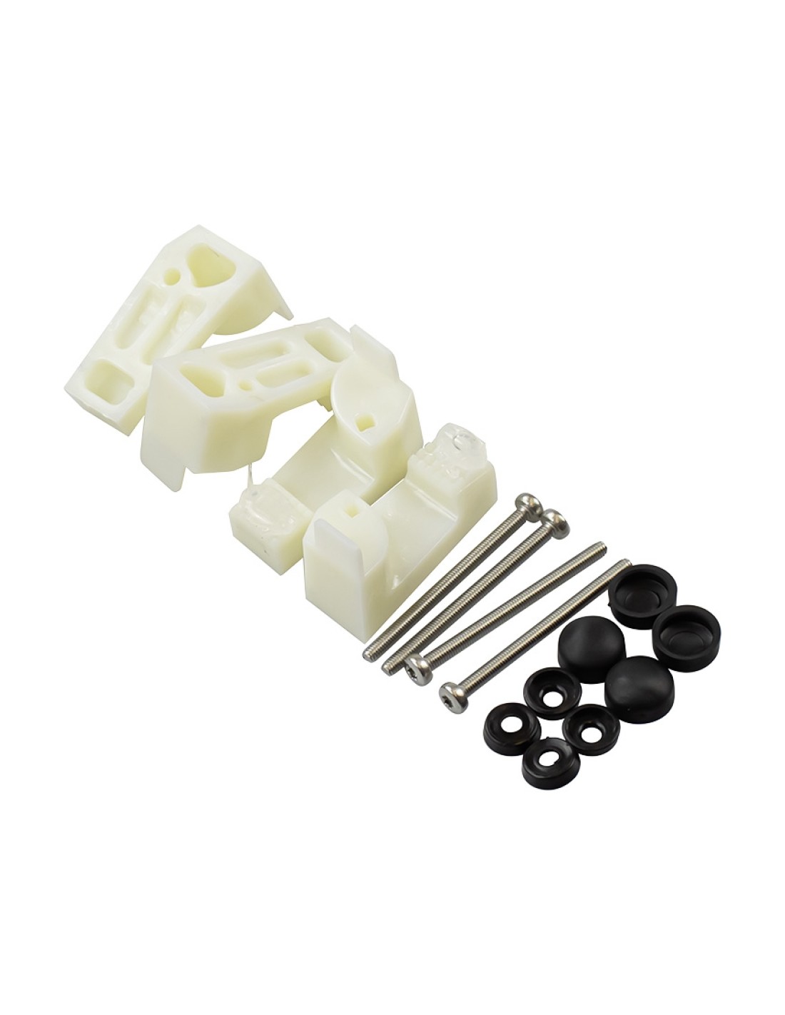 É composto por quatro pequenas peças brancas e seus quatro parafusos alongados correspondentes, com oito juntas de borracha.