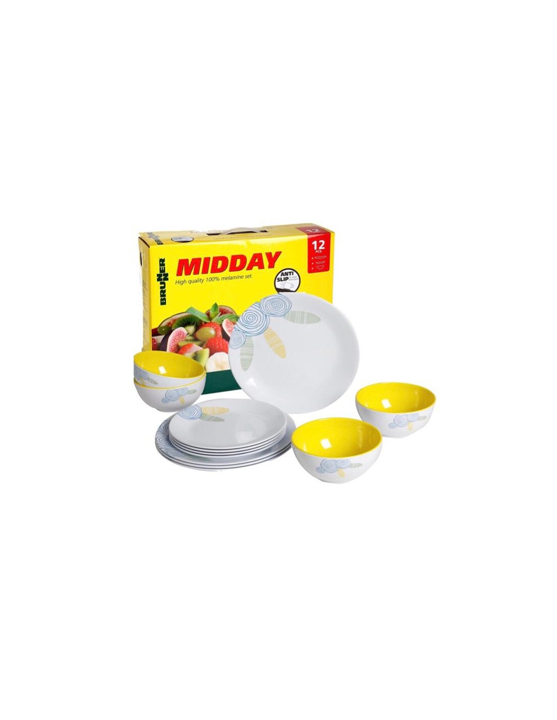 Louça de melamina com 12 peças para 4 pessoas.