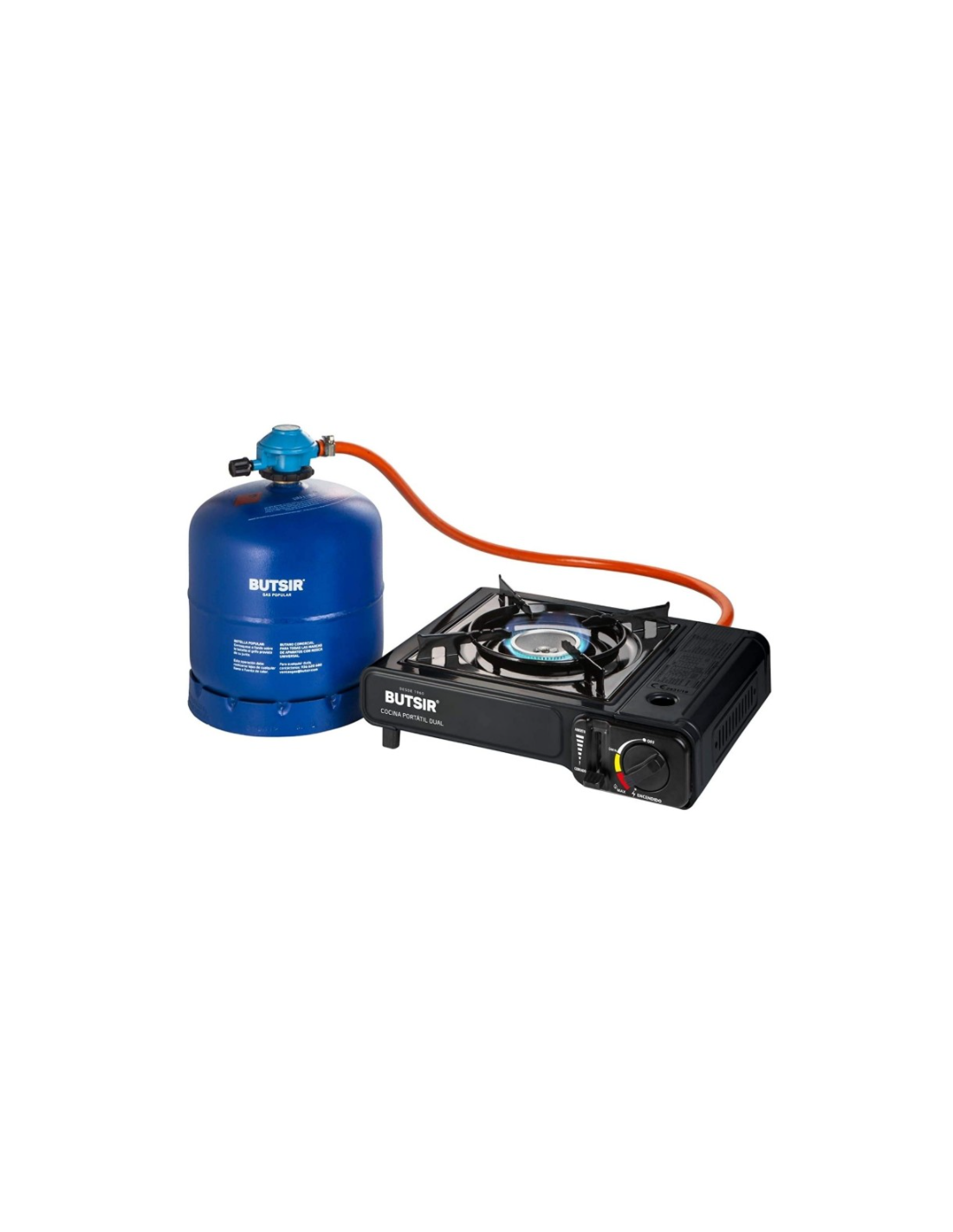 Cozinha portátil que funciona tanto com cartuchos b-250 como com botijões de gás de 3, 6 e 12 Kg.