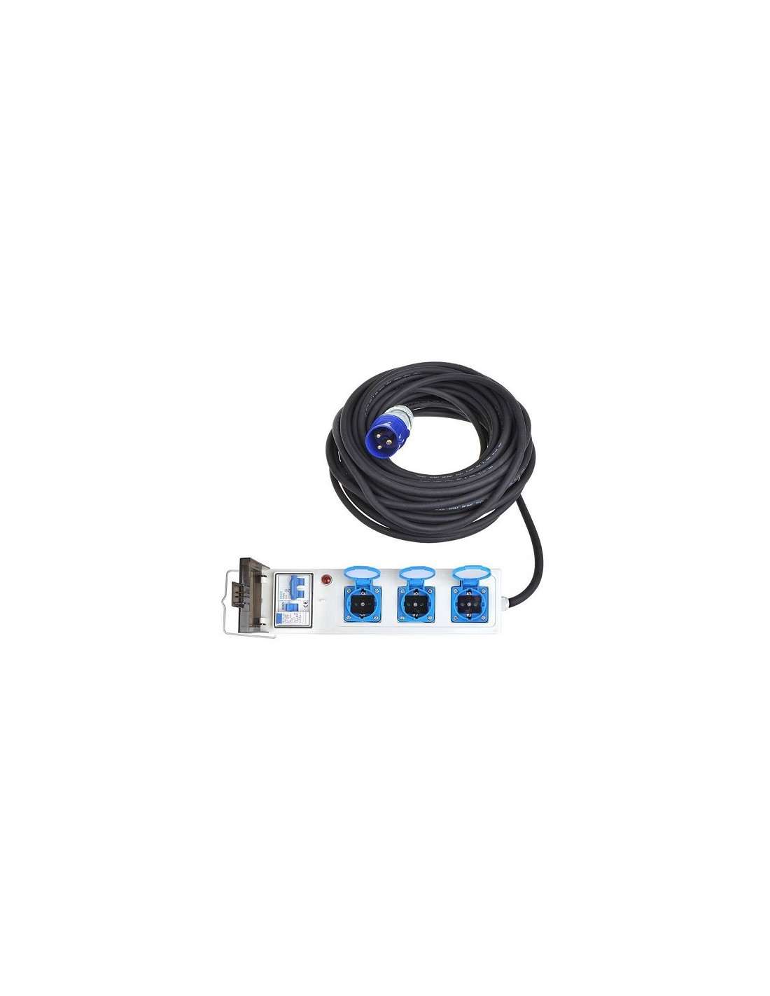 Este distribuidor de energia consiste em 3 conexões Schuko com uma tomada de 230 V cada e um plugue cetac macho.