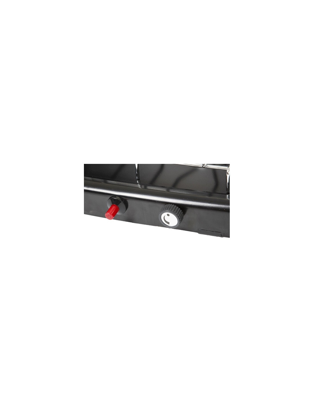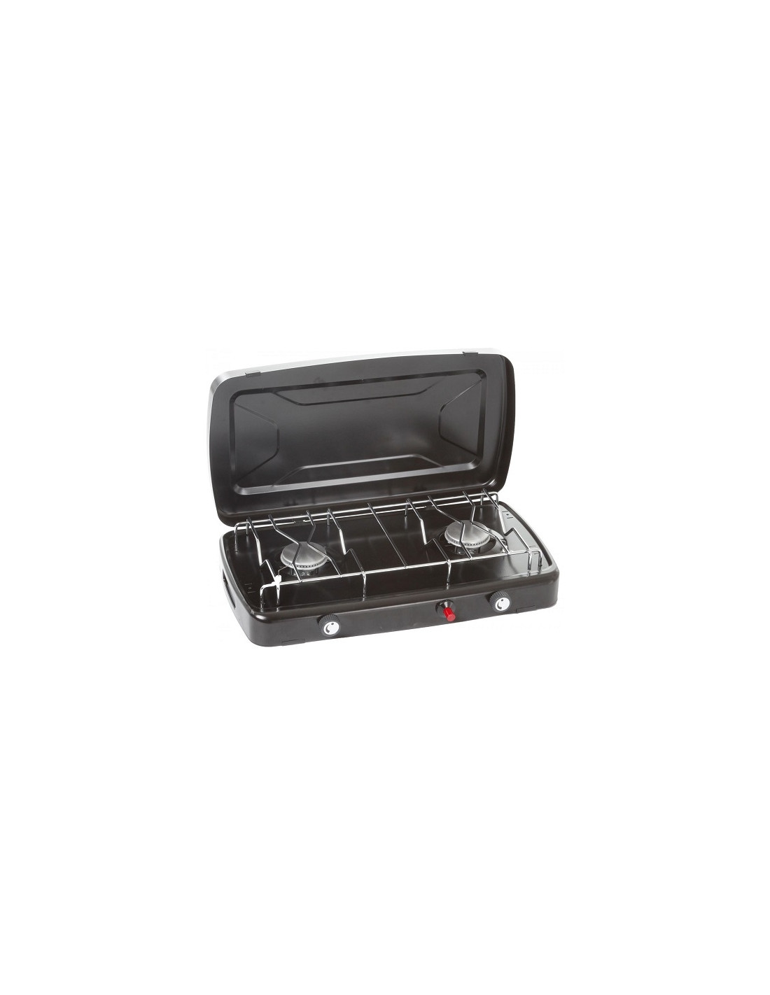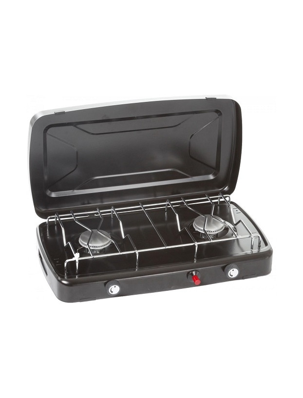 Fogão de campismo com 2 queimadores e comandos separados com ignição piezoeléctrica.