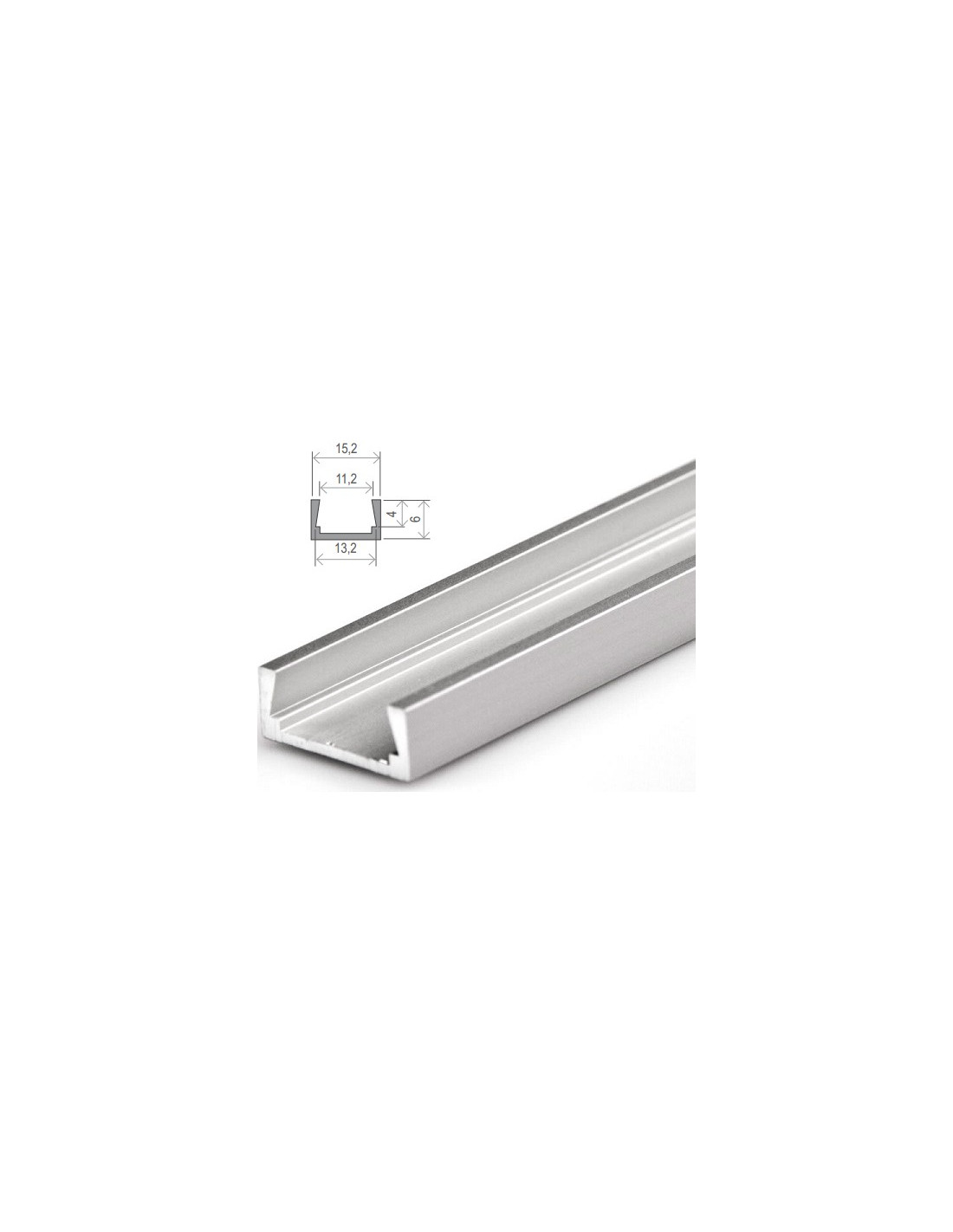 Perfil de alumínio de superfície com 1 metro de comprimento e mede 15,2x6 mm (largura x altura).