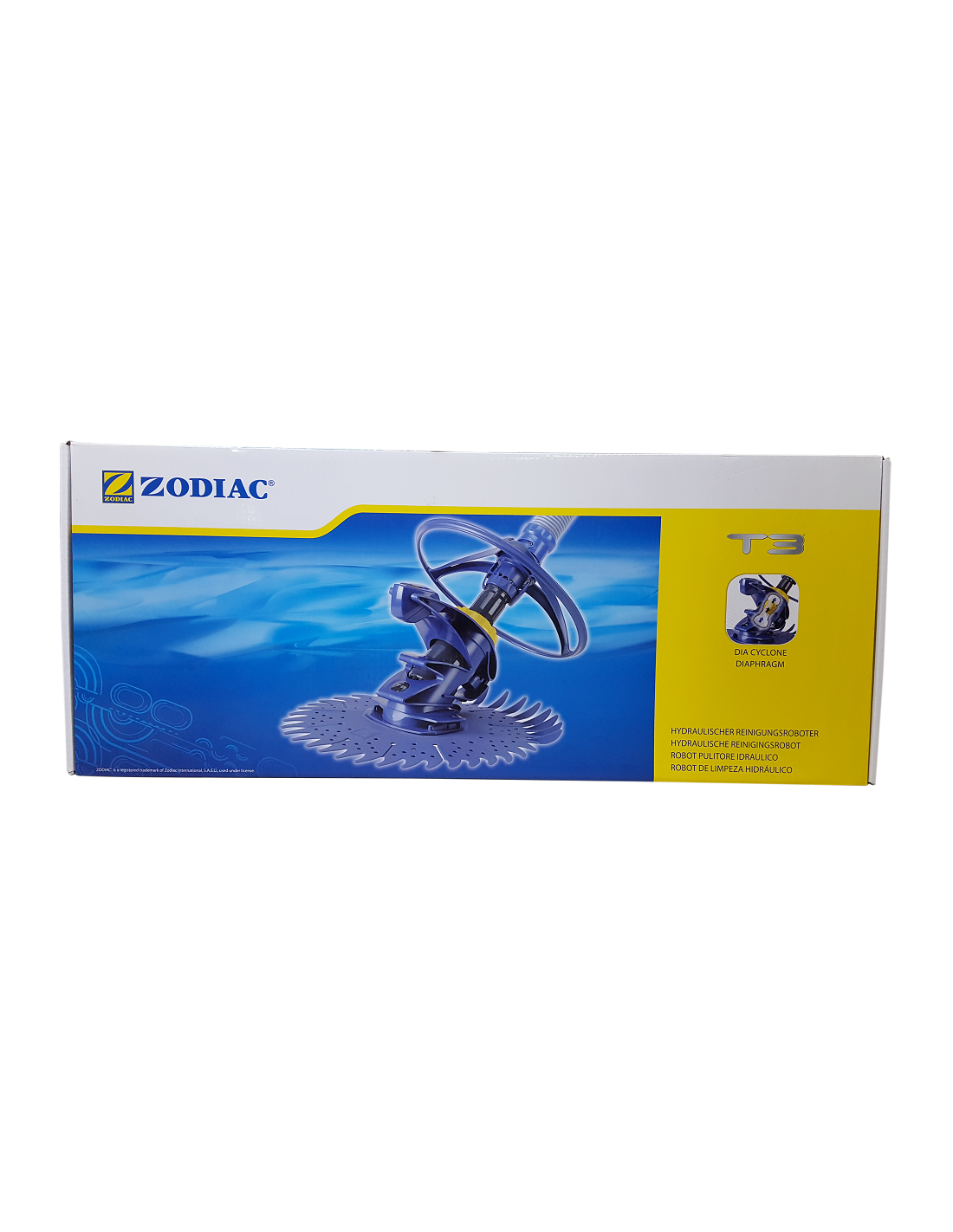O aspirador hidráulico Zodiac T3 é um concentrado de inovações e tecnologia. Equipado com o diafragma Diacyclone patenteado da Zodiac, foi concebido para limpar eficazmente piscinas com dimensões não superiores a 9 x 5 metros. O Zodiac T3 é adequado para piscinas enterradas e para piscinas elevadas, retangulares ou ovais, de fundo plano ou com declive suave, e para todos os tipos de revestimentos (ladrilhos, liner, poliéster, betão pintado e PVC armado ).