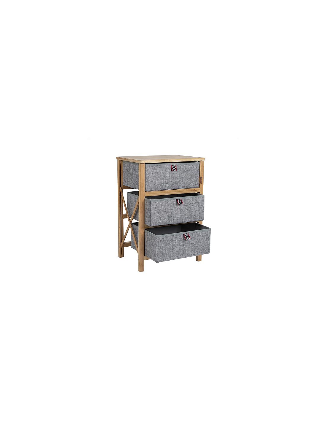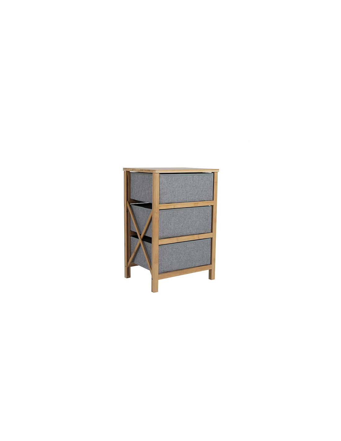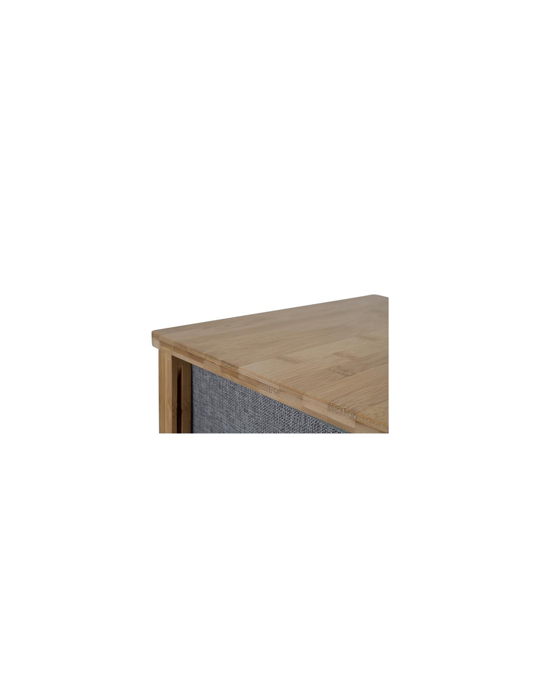 O armário tem uma estrutura de bambu e três gavetas em poliéster 600D Oxford.