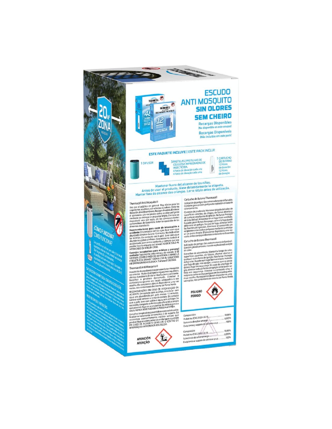 O difusor thermacell tem uma proteção anti-mosquito de 20 m2 no exterior, para desfrutar do jardim, relva, alpendre, pátio ou à volta da piscina, sem o incómodo dos mosquitos; Testado nos locais mais exigentes do planeta.