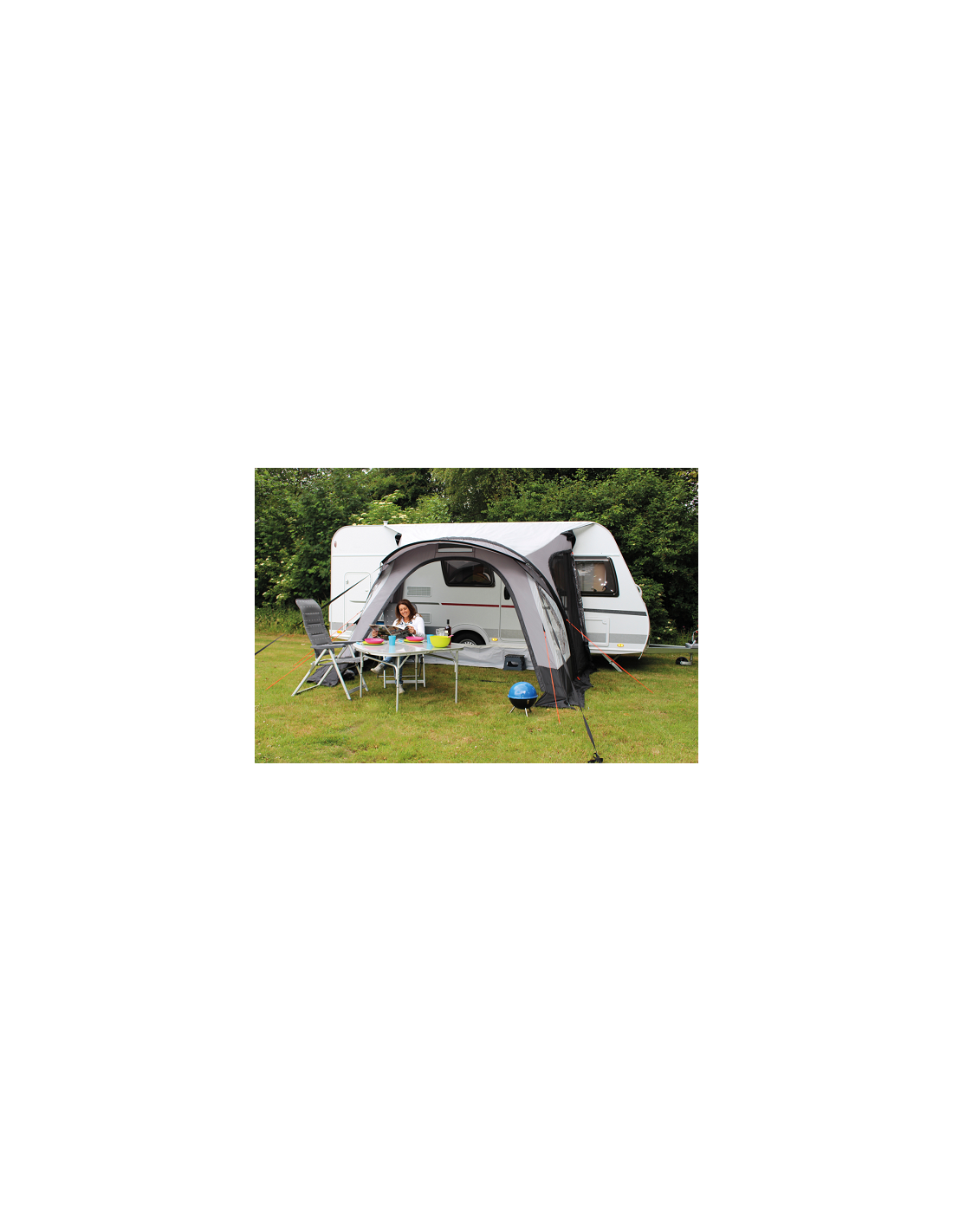 A barraca vem com barras de pressão que permitem posicioná-la firmemente contra a barraca da caravana (incluída).